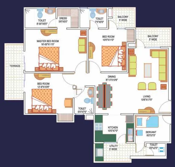 | 4 BHK + Servant + 5 Toilets | 1705 Sq.Ft | |