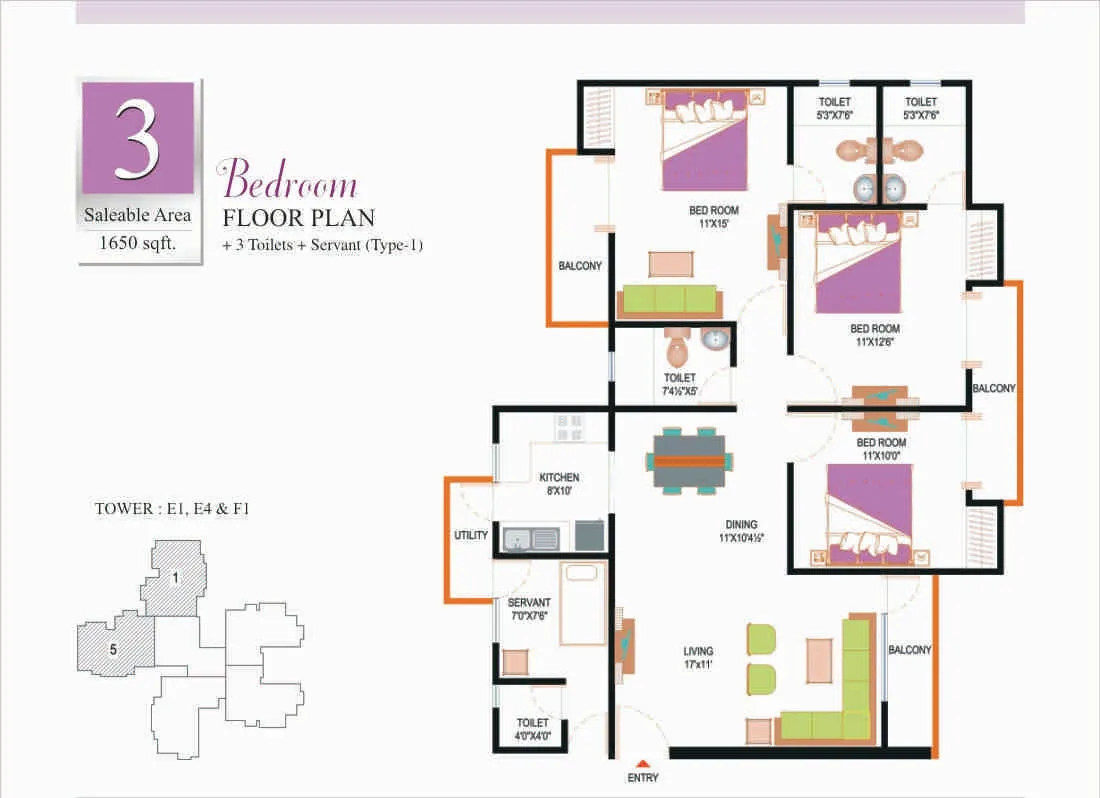 | 3 BHK + 2 Toilets | 1095 Sq.Ft | |